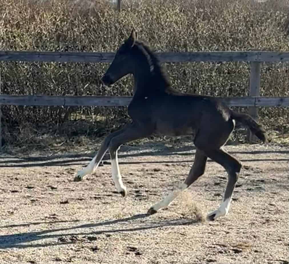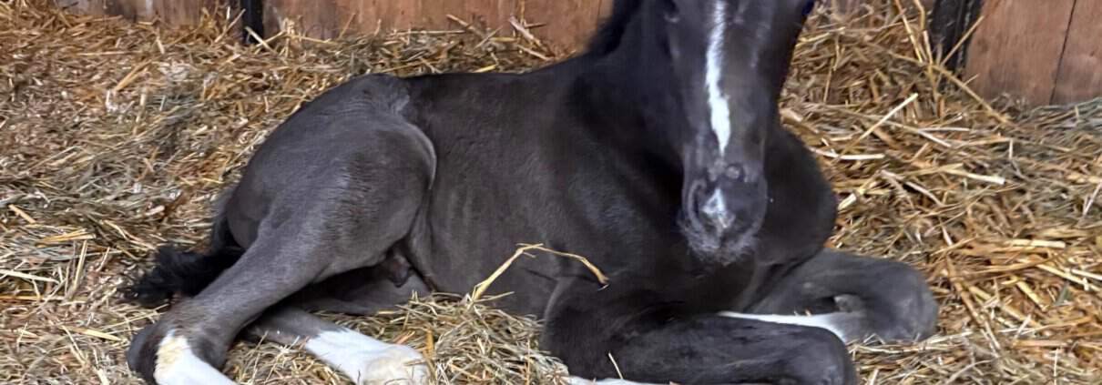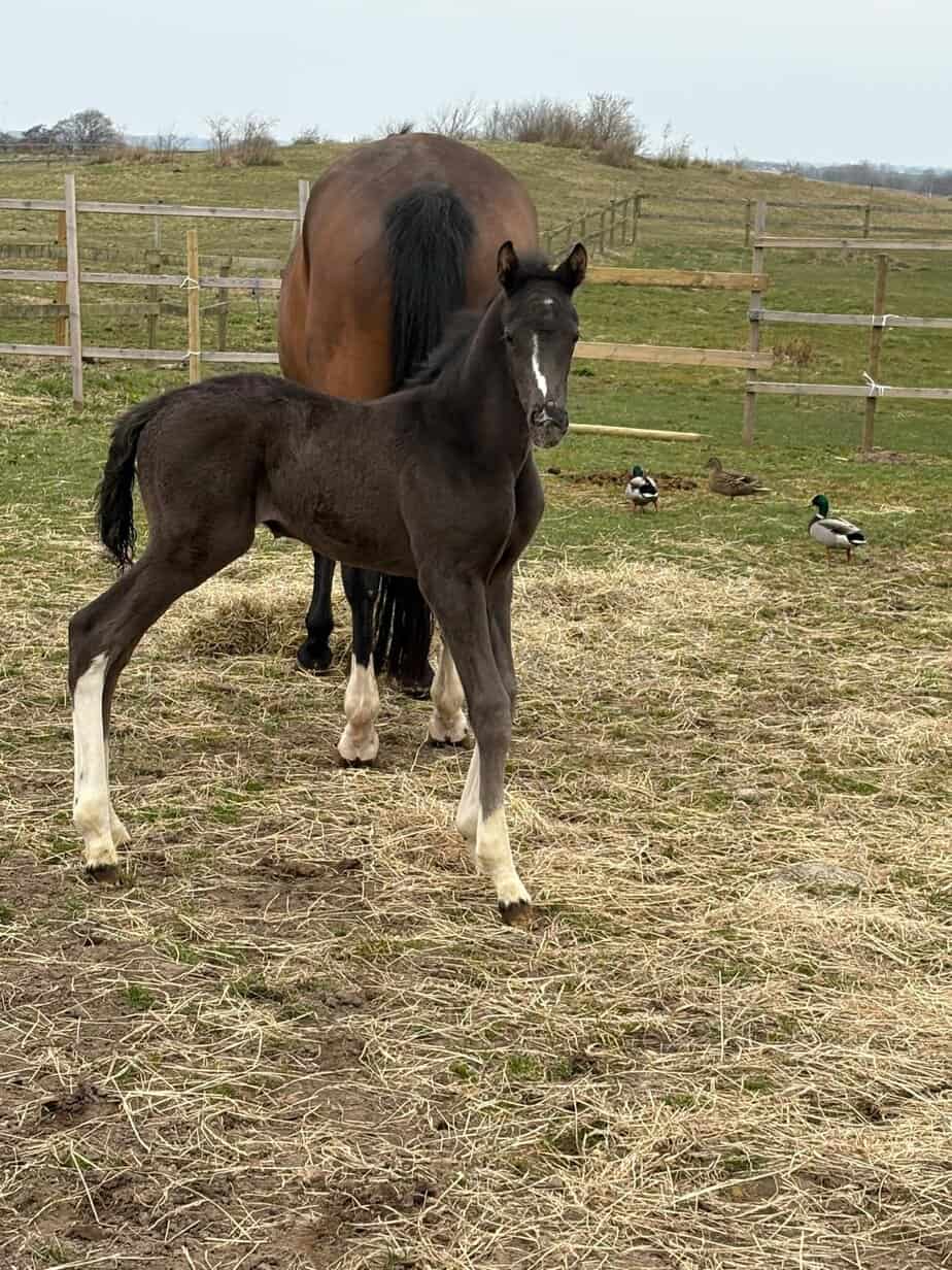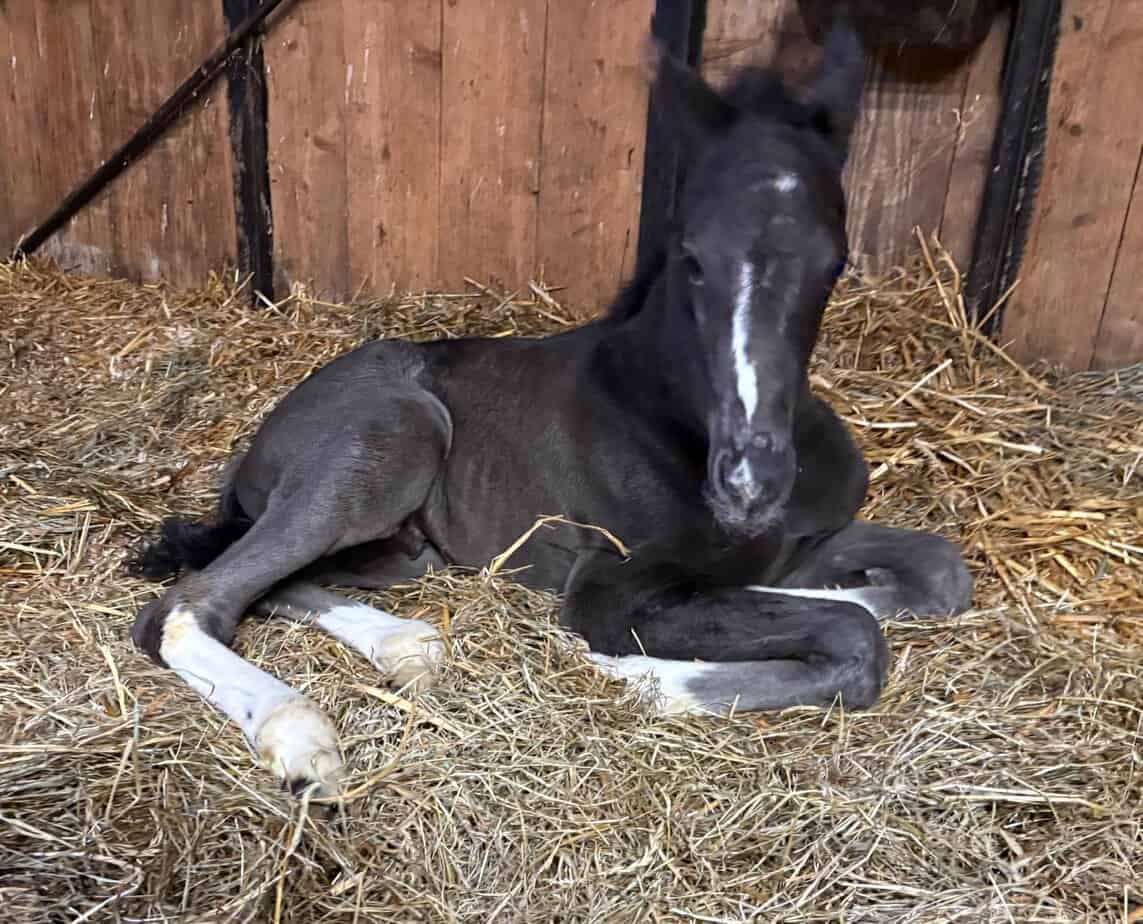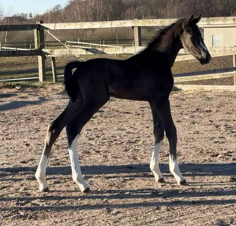 Äntligen efter 3 veckors vakande kom han, en superfin svart hingst med 4 vita strumpor och strimbläs