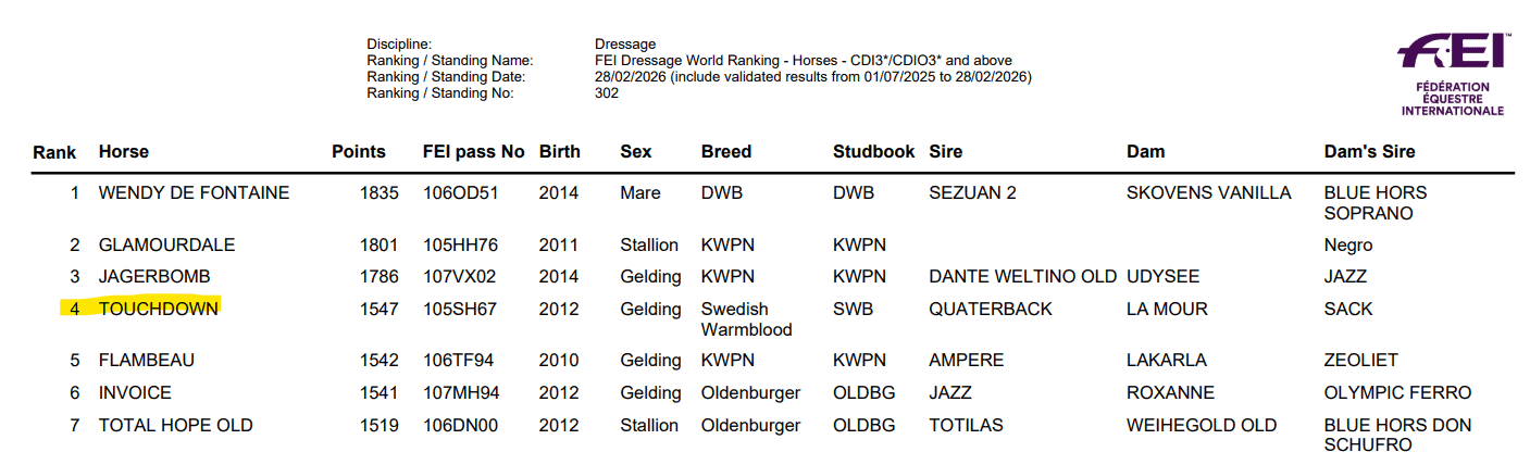 Jättekul att vår Touchdown nu är rankad 4a i FEIs dressyr ranking. Tänk att han varit i topp under så många år, vi är så stolta!